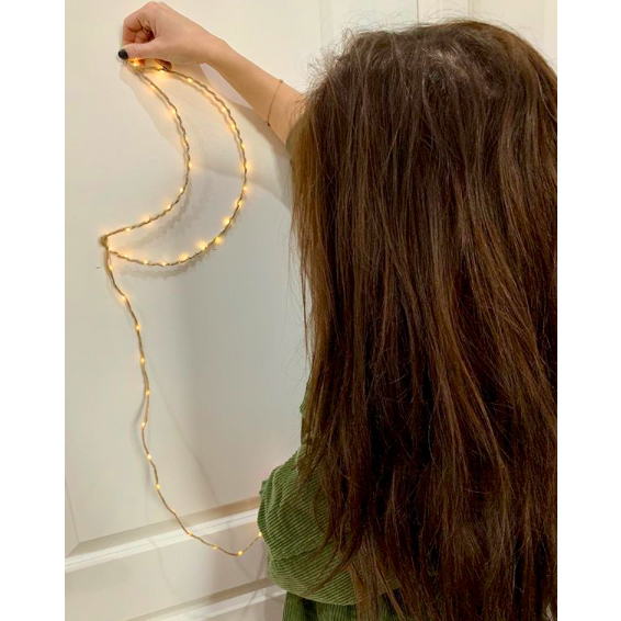 Deze maanhanger is prachtig voor de kinderkamer. De lamp is gemaakt van ijzer (zilver) en heeft een subtiele touw afwerking zodat de lamp er ook mooi uitziet wanneer hij uit staat overdag. De maanlamp heeft 40 warme koperen led lampjes die genoeg licht geven om te gebruiken als nachtlamp. Totaal snoer is 2 meter. Aan de onderkant van de maan kun je het batterijdoosje vinden. Deze kun je leuk wegwerken door in een mand op een plank te plaatsen of je kunt hem laten hangen. De lamp is met de hand, veel liefde en vakmanschap vervaardigd. Iedere maan is dus uniek!