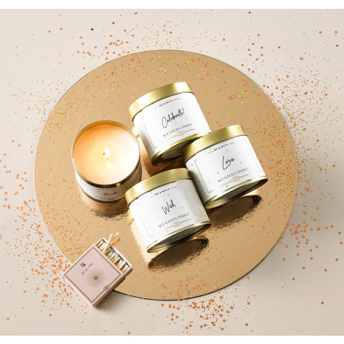 TINNEN GEURKAARS – De tinnen geurkaars wordt verpakt in een bijpassend design in een gouden tin. De kaars is perfect geschikt is voor alle cadeaumomenten en makkelijk om mee te nemen op reis! Het kaarslicht zal blijven branden voor 35 uur.